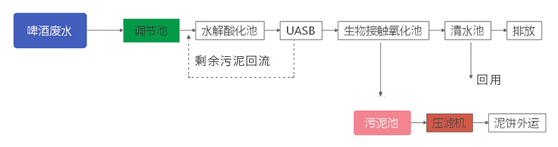 啤酒廢水先經(jīng)過中格柵去除大雜質(zhì)后進(jìn)入集水池,用污水泵將廢水提升至水力篩,然后進(jìn)入調(diào)節(jié)池進(jìn)行水質(zhì)水量的調(diào)節(jié)。進(jìn)入調(diào)節(jié)池前,根據(jù)在線PH計(jì)的PH值用計(jì)量泵將酸堿送入調(diào)節(jié)池,調(diào)節(jié)池的PH值在6.5~7.5之間。調(diào)節(jié)池中出來的水用泵連續(xù)送入UASB反應(yīng)器進(jìn)行厭氧消化,降低有機(jī)物濃度。厭氧處理過程中產(chǎn)生的沼氣被收集到沼氣柜。UASB反應(yīng)器內(nèi)的污水流入CASS池中進(jìn)行好氧處理,而后達(dá)標(biāo)出水。來自UASB反應(yīng)器、CASS反應(yīng)池的剩余污泥先收集到集泥井,在由污泥提升泵提升到污泥濃縮池內(nèi)被濃縮,濃縮后進(jìn)入污泥脫水機(jī)房,進(jìn)一步降低污泥的含水率,實(shí)現(xiàn)污泥的減量化。污泥脫水后形成泥餅,裝車外運(yùn)處置。